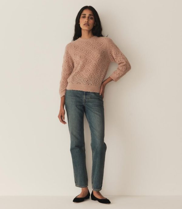 In a soft baby alpaca blend, the ‘60s-inspired Emiliana Sweater features a crew neck, full-length sleeves, a slightly relaxed silhouette, and an intricate allover pointelle design.