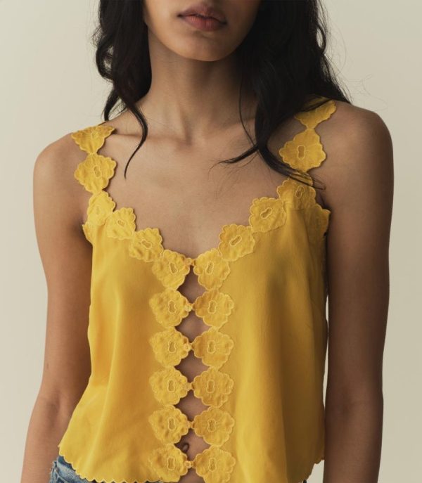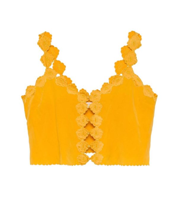 In a luminous silk crepe de chine, the Flores Top features intricate silk satin floral appliqués at the shoulder straps and plunging V-neckline. Flower-shaped mother-of-pearl buttons extend down the front, while playful cutouts allow for a glimpse of skin. The slightly cropped hemline is adorned with scallop detailing.