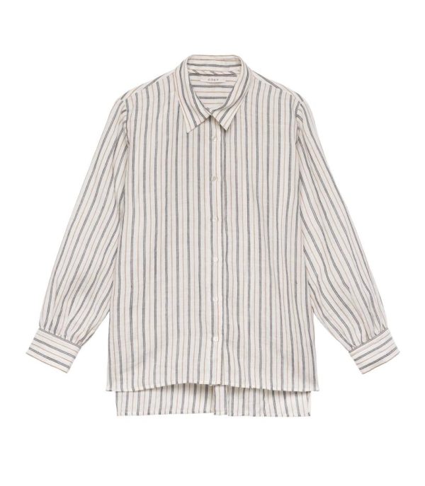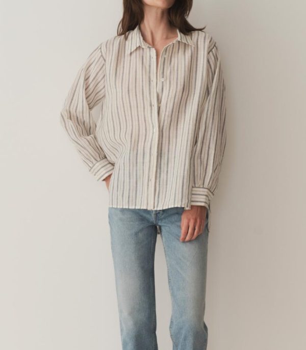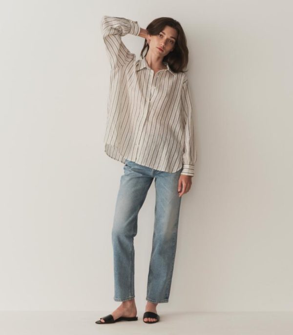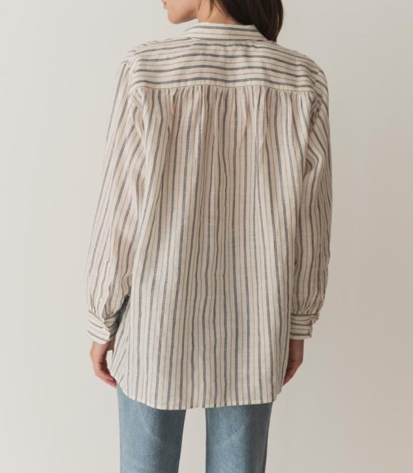 Tailored in crisp, lightweight ramie and rendered in our nostalgic San Leone Stripe, the Hava Top—a favorite of our co-founders, Margaret and Katherine—is our take on an oversized, menswear-inspired button-down. Slightly longer in back than in front, it features a classic collar, full-length sleeves, and mother-of-pearl buttons down the center front. Shirring at the back yoke creates a drapey effect.
