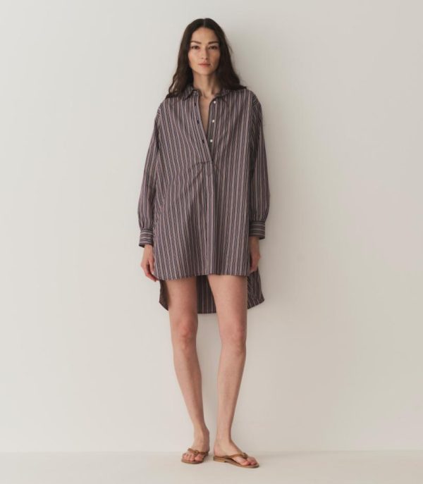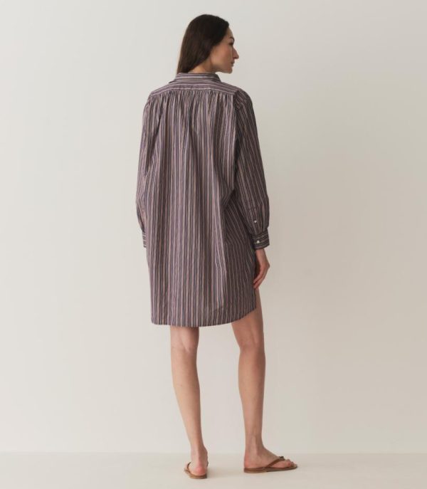 Tailored in crisp cotton poplin and rendered in our yarn-dyed San Marino Stripe, the Jora Dress—a favorite of our co-founders, Margaret and Katherine—is our take on an oversized shirtdress. Slightly longer in the back than in front, it features a classic collar, full-length sleeves, and mother-of-pearl buttons. Shirring at the back yoke creates a drapey effect.