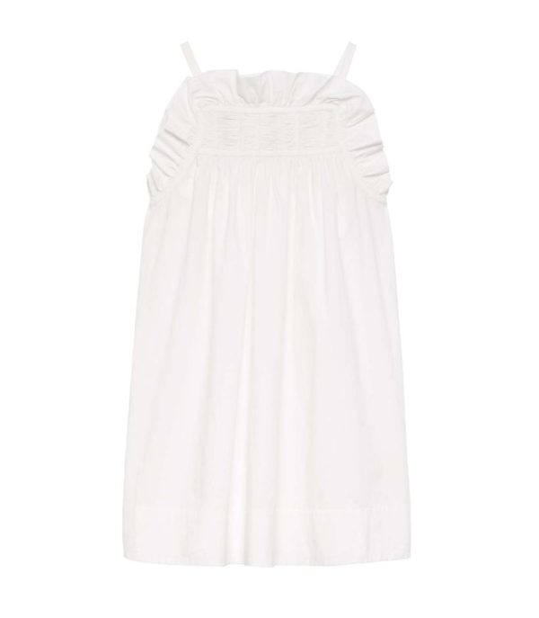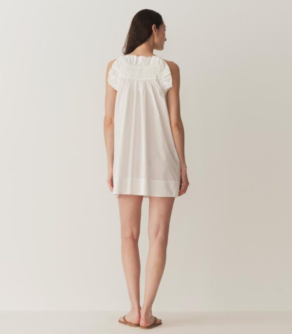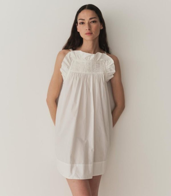 In crisp 100% organic cotton poplin, the Lynette Dress is a ‘60s-inspired pullover mini. It features spaghetti straps, a square neckline with a ruffle trim, a breezy A-line cut, and a square yoke adorned with shirred panels.