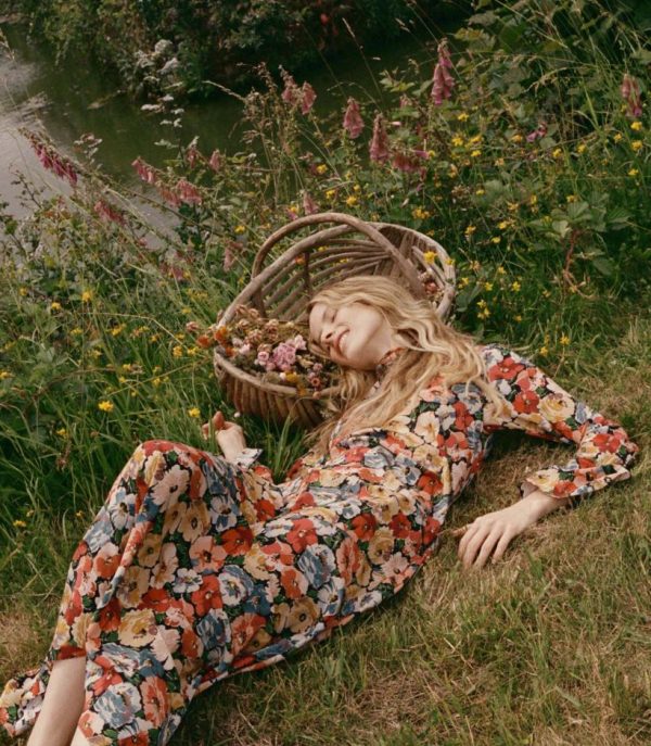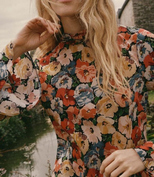 In washed silk crepe de chine, the Musetta Dress features a mock neck and flared full-length sleeves trimmed with ruffles at the cuffs. A fitted bodice with an invisible side zipper gives way to an ankle-grazing bias-cut skirt.